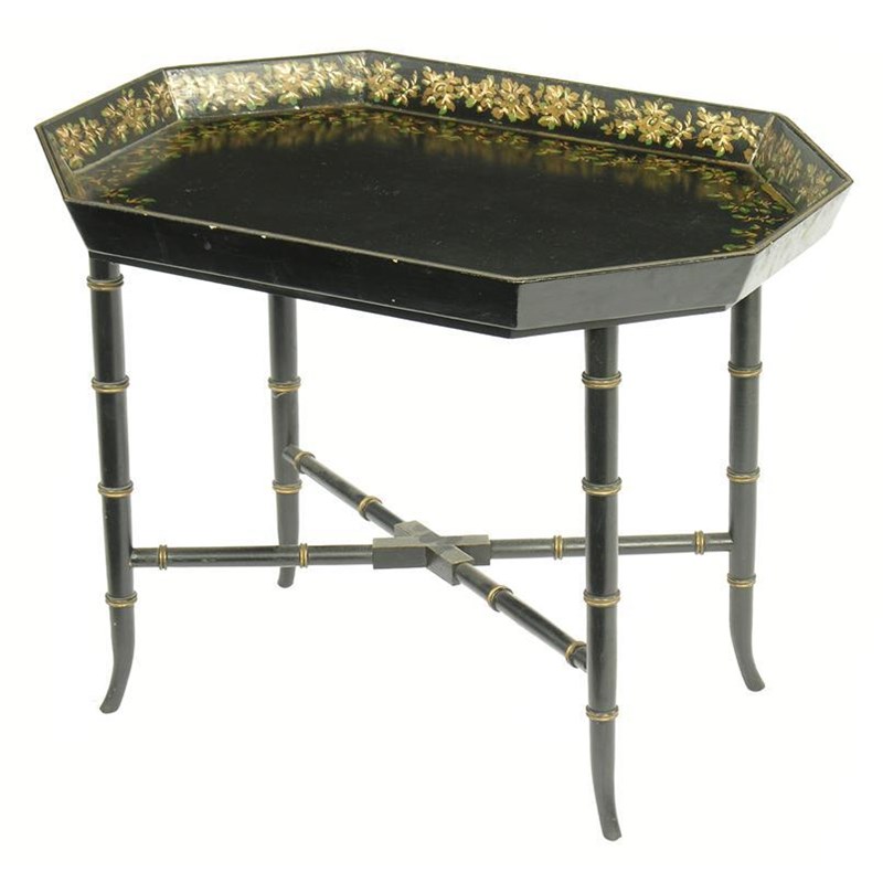 A Japanned gallery tray, decorated foliage on an ebonised and parcel gilt 'bamboo' stand, 19.75in (50cm) h, 25.75in (65.5cm) w, 18.5in (47cm) d. (2)