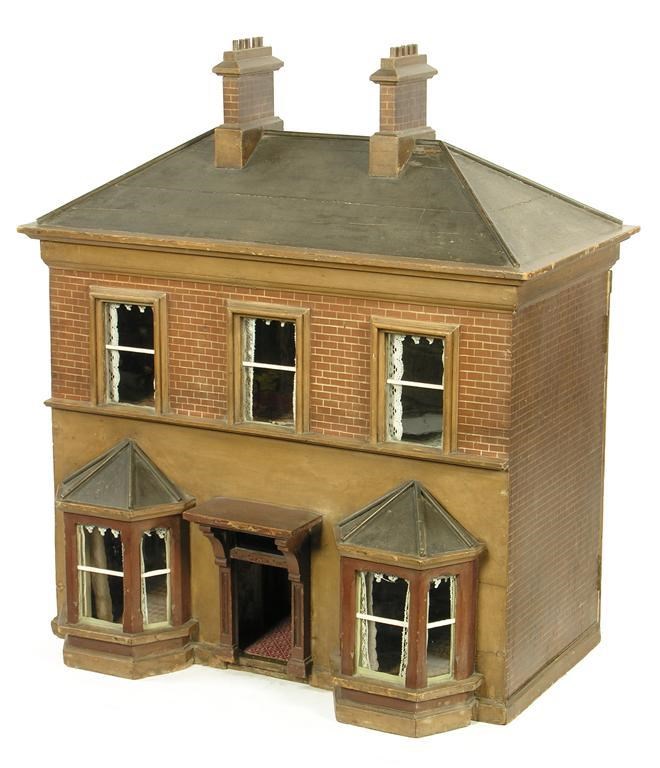 A Victorian painted doll's house, the two story building with bay windows to the ground floor, the reverse with a pair of doors to five rooms and a hallway, 41.5in (105.5cm) h, 36.5in (92.5cm) w, 22in (56cm) d.