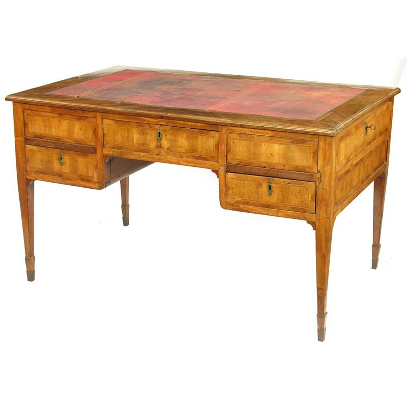 A late 18th century Italian olive wood bureau plat, the rectangular moulded edge top with an later inset leather with crossbanding and stringing above a central frieze drawer, flanked by two false drawers above two real drawers each side with a frieze drawer on square tapering legs with later spade feet, 29.75in (75.5cm) h, 50.5in (128cm) w, 32.5in (82.5cm) d.