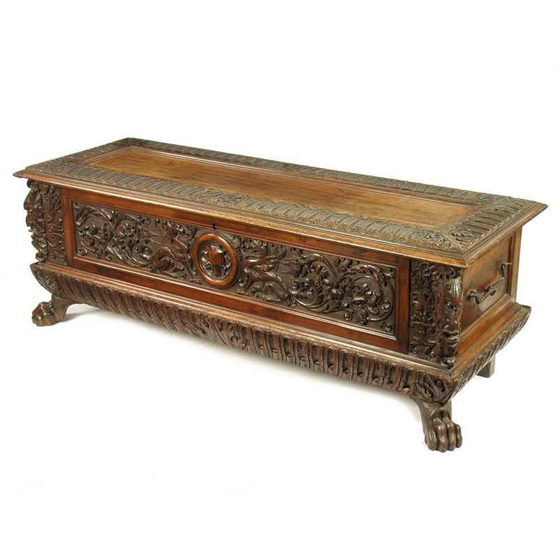 A late 17th century Italian walnut cassone, with carved decoration and hinged cover, the front with a central cartouche flanked by arabesques on a shaped apron to later paw feet, 24.75in (63cm) h, 71.5in (181.5cm) w, 25.5in (65cm) d.