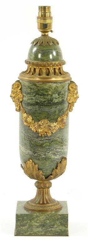A French green marble and gilt brass mounted table lamp, 15.75in (40cm) h, excluding fitting.
