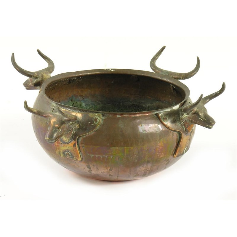 A hammered copper bowl, with four applied Ox lifts, 4.75in (12cm) h, 11in (28cm) dia.