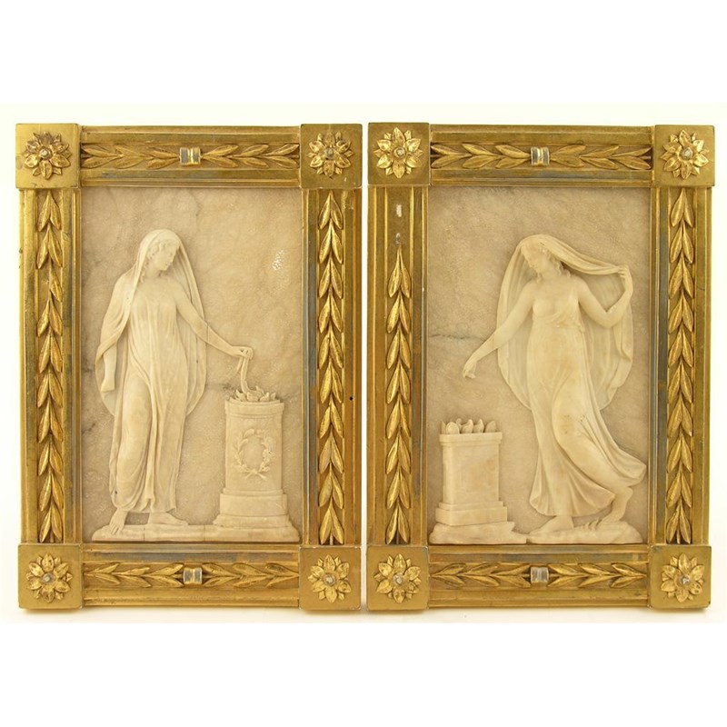 A pair of Italian marble panels, depicting classical ladies next to braziers, 7.5 x 4.75in (19 x 12cm) in. in giltwood frames. (2)