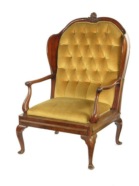 An 18th century Dutch mahogany wing armchair, the later button upholstered back with a moulded frame and carved foliage cresting to shaped wings, the open scroll arms to a later padded seat on cabriole legs to pad feet, the back previously hinged.