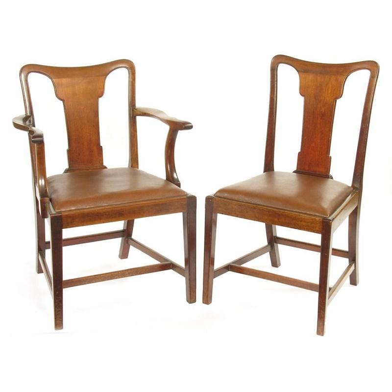A set of six late Victorian mahogany dining chairs, with leatherette drop in seats comprising a pair of open armchairs and four side. (6)