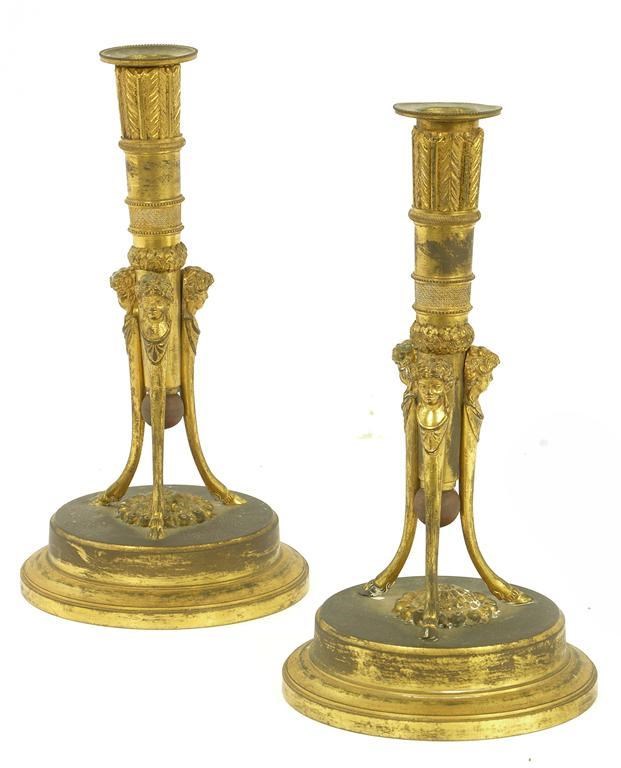 A pair of French gilt brass candlesticks, the tapering cylindrical holder decorated as a quiver of arrows on three monopodia supports, 9.5in (24cm) h. (2)