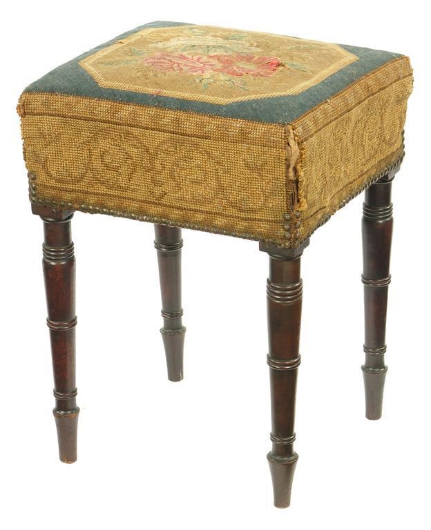 An early 19th century stool, the floral needlework seat on ring turned mahogany legs, 19.75in (50.5cm) h, 14.5 x 13in (37 x 33cm).