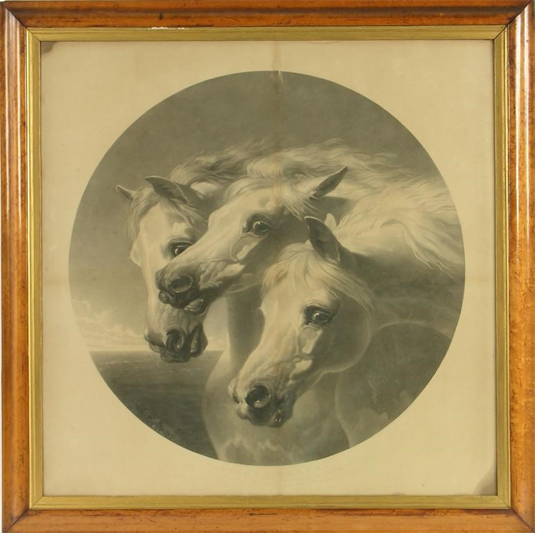 After John Frederick Herring. Pharaoh's Horses, an engraving, 24in (61cm) dia, in a bird's eye maple frame.