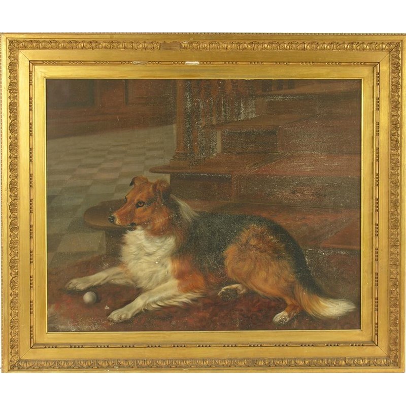 A Victorian portrait of a collie dog, oil on canvas, indistinct signature and dated 1879, 23 x 28.25in (58.5 x 72cm).