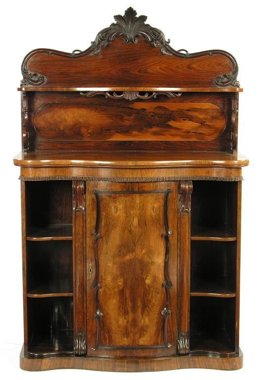 A 19th century rosewood serpentine front side cabinet, the raised back carved a shell and foliage with a shelf on open supports with turned finials, the frieze with a ripple moulding above an outline panelled central door flanked by open shelves, 62.5in (158.5cm) h, 40.25in (102cm) w, 18in (45.5cm) d.