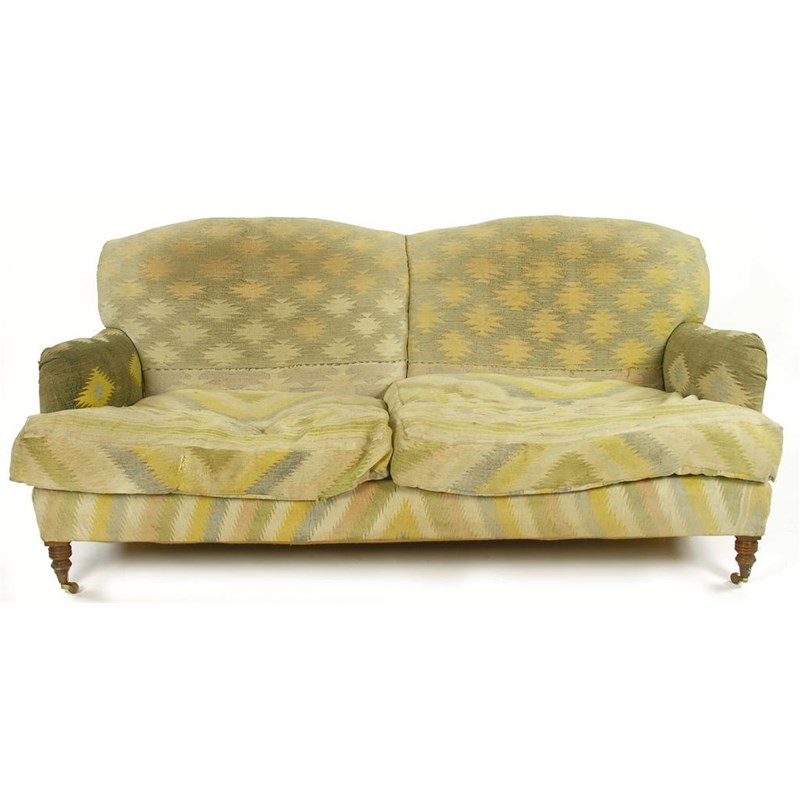A two seater sofa with kelim style upholstery on turned beech legs to brass castors