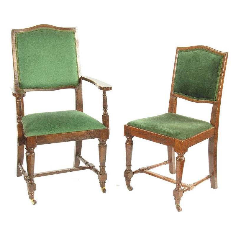 A set of ten oak dining chairs, the padded backs to drop-in seats on turned legs united by H stretchers to ceramic castors, comprising; a pair of modern open armchairs and a set of eight side chairs, one with a brass trade label for 'Warings'. (10)