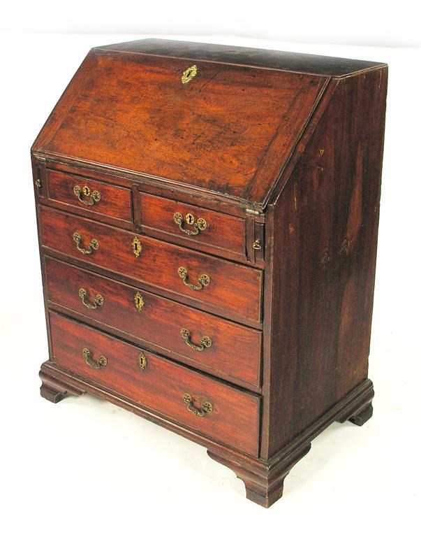 A George III mahogany small bureau, the moulded edge flap with later hinges to pigeon holes and drawers, above two short and three long graduated drawers fitted later brass handles and escutcheons, on later ogee bracket feet, 39.5in (100cm) h, 33in (84cm) w, 20.75in (53cm) d. Old restoration.
