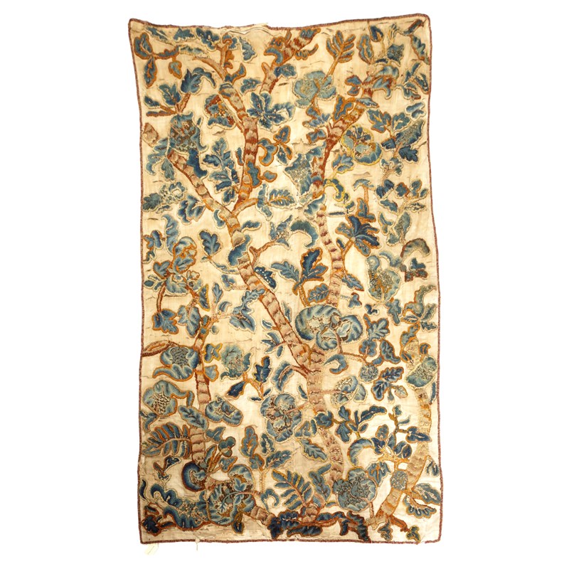 worked in worsted wools with foliate branches applied to the reverse of an 18th century wool brocaded linen with a floral and fruiting sprig design, the whole edged with a woven wool braid, backed with buckram