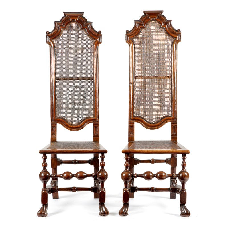 each with a caned back and seat with a moulded frame, on ball and baluster turned front legs united by a conforming stretcher and on Braganza feet (2)