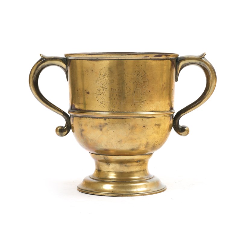 Mid-18th century loving cups in brass are rarer than their silver counterparts. For similar examples one with a cover and another with traces of silvering, see R. Gentle & R. Field, 'Domestic Metalwork 1640-1820', pp.278-9, figs. 1-3.