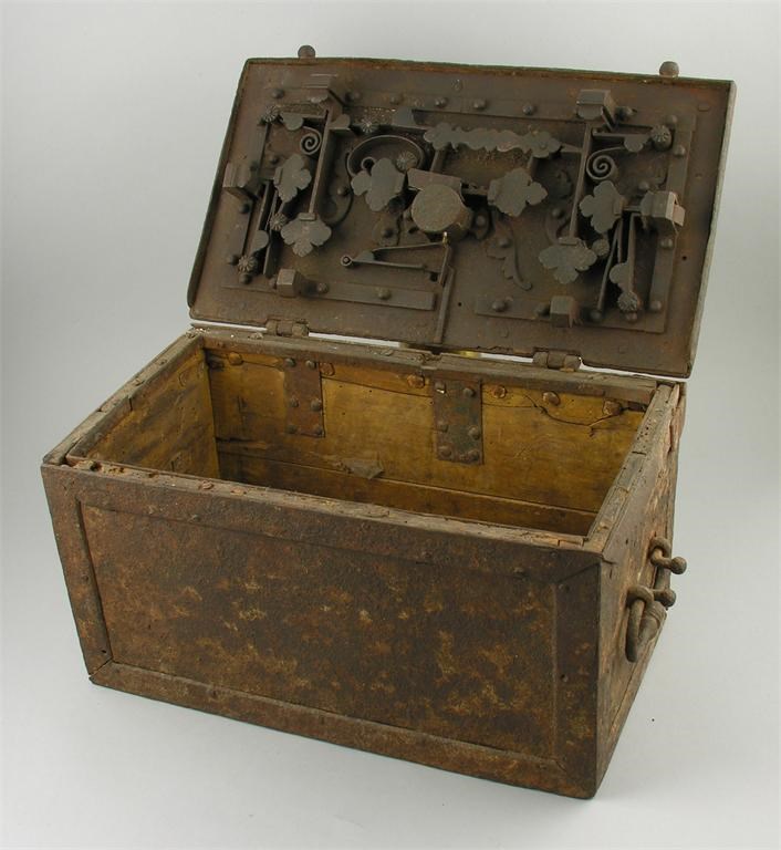 A small 17th century iron strong box, the panelled body with side carrying handles, to a hinged cover with an open lock having four bolts, no key, 8.5in (21.5cm) h, 16.5in (42cm) w, 10in (25.4cm) d. Provenance: Collection of Lady Conway, Saltwood Castle, Kent. 1955.