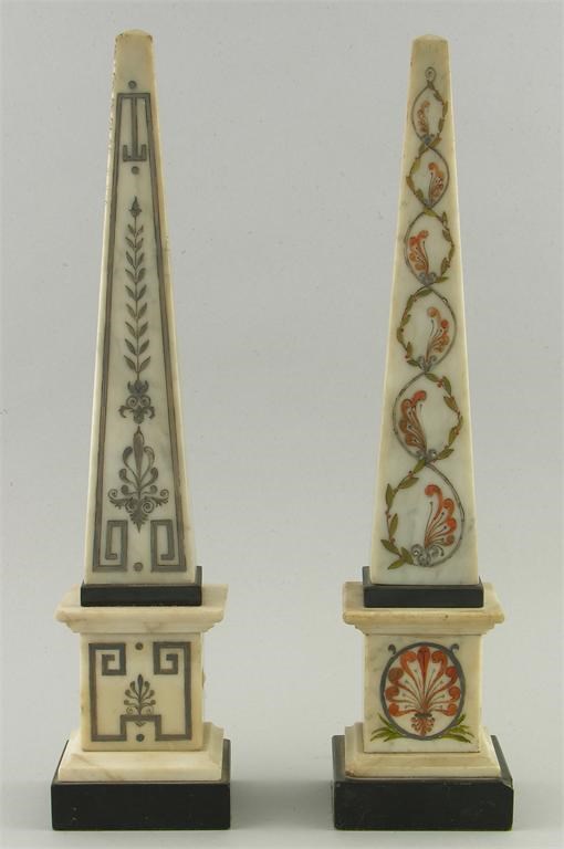 A pair of painted marble and slate obelisks, one side polychrome decorated with anthemion and laurel, the monochrome reverse including Greek key borders, 14.5in (37cm) h. (3) Minor chips and re-gluing.