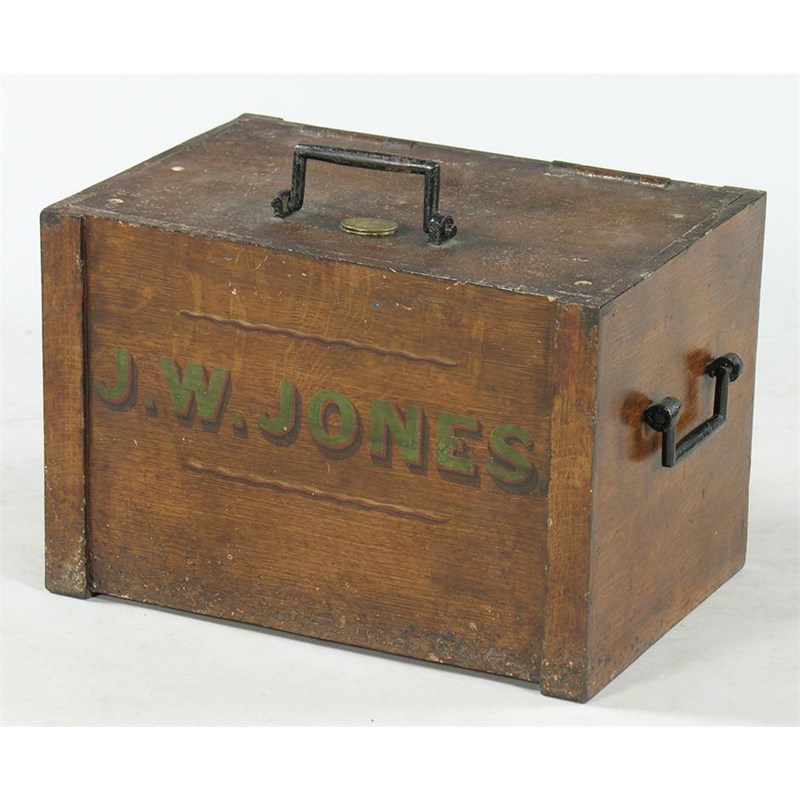 A simulated wood iron strong box, the hinged lid with a brass covered escutcheon inscribed 'PLIMSAUL BROTHERS, PLYMOUTH' the front painted 'J.W. Jones', side carrying handles, 13in (33cm) h, 20in (50.8cm) w, 13.5in (34.4cm) d, (the lid with military arrow).