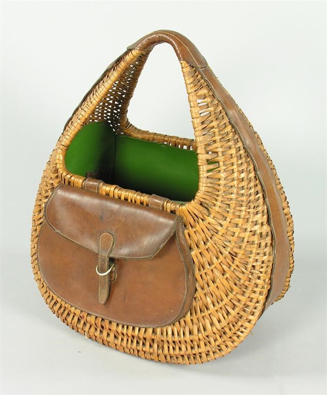 A Gucci wicker and leather picnic basket, the inside with loop straps and wicker glass holders, the front pouch stamped 'MADE IN ITALY BY Gucci,' 21.5in (54.5cm) h, 18in (45.6cm) w.
