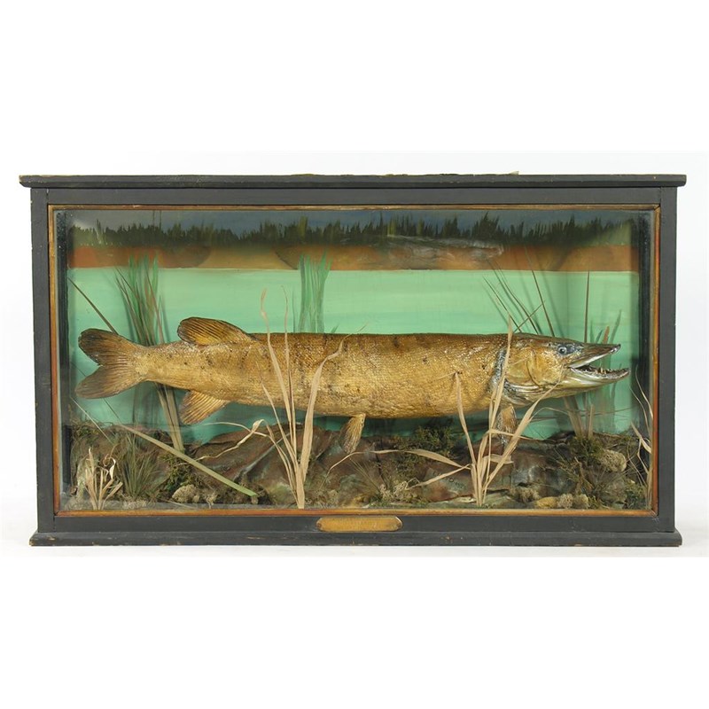 A cased pike, with a brass plaque inscribed 'Caught by Jack Payne, 31st October 1925, Weight 19LBS 4oz', the naturalistic base inscribed 'LLYOD 1925', 26.25in (66.6cm) h, 46.25in (117.4cm) w, 10.5in (26.6cm) d.