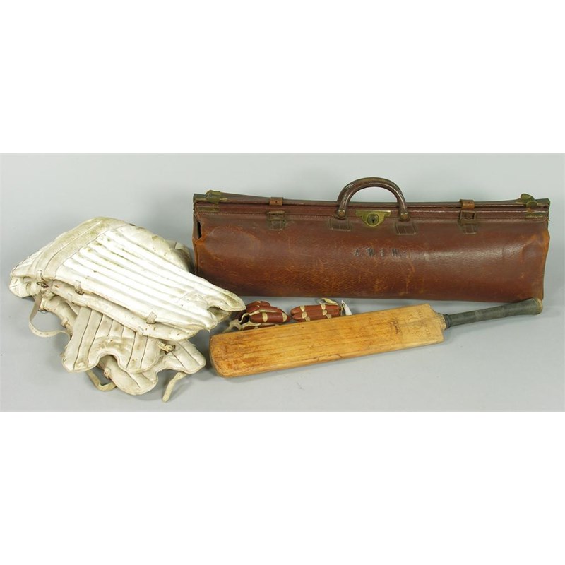 A leather and brass mounted cricket bag, stamped with the initials 'A.W.I.W.' containing two pairs of pads stencilled marks 'THE "J.B.HOBBS" PATENT No.193234 SOLE MAKER FRANK BRYAN LTD,' and a bat with stamped makers and facsimile signature, signed in ink 'AWI Warren', the back bears signature 'JB Hobbs.'