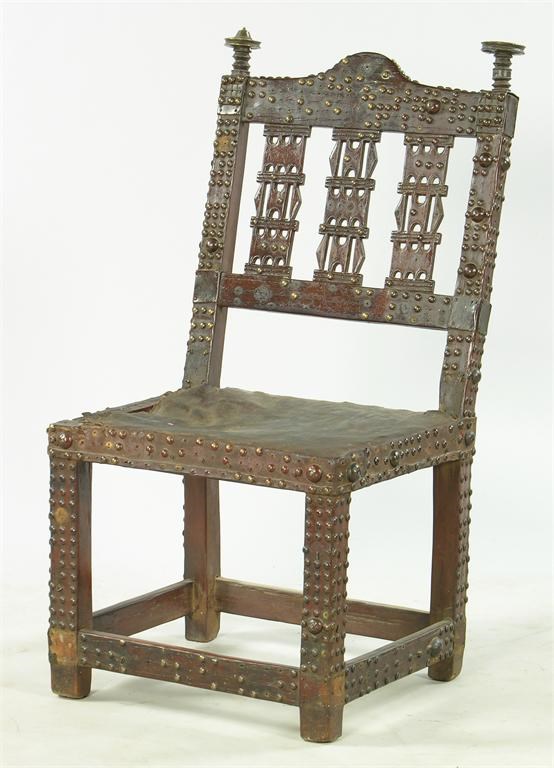 A 19th century Ashanti asipim chair, painted hardwood with brass stud decoration, having a leather covered seat, 31.5in (80cm) h.