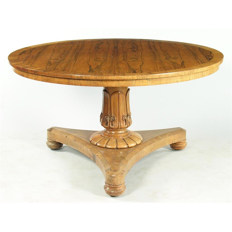 A George IV rosewood centre table, the circular crossbanded tilt-top on a turned and carved lappet and foliage stem, to a faceted triform base with turned feet and sunken brass castors, 29in (73.5cm) h, 52in (132cm) dia. Old restoration.