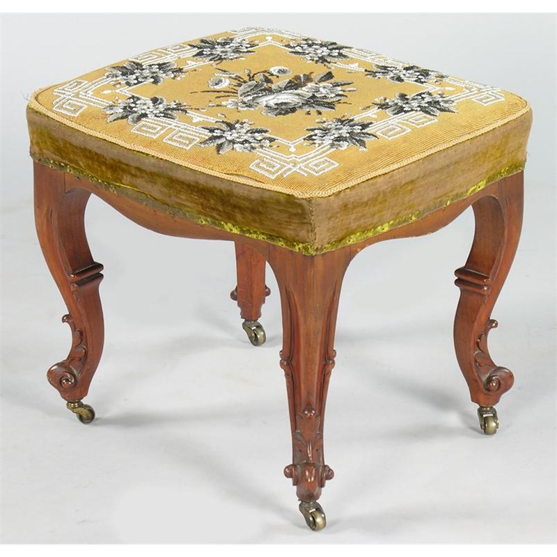 A Victorian carved walnut stool by Lamb of Manchester, the serpentine top with a bead work floral panel, on leaf carved cabriole legs to knurled toes and brass castors, the frame stamped 'LAMB MANCHESTER', 16.5in (42cm) h, 18 x 16.5in (45.7 x 42cm).