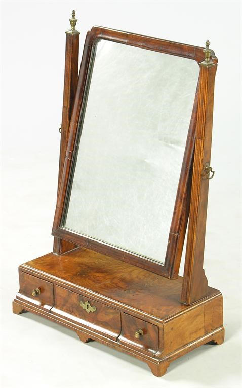 A walnut dressing table mirror, the rectangular plate within a moulded cusp cornered frame, on moulded supports with brass urn finials, the caddy moulded box base with three sloping front walnut lined drawers, on bracket feet, 18th century and later, 25.75in (65.4cm) h, 17.5in (44.5cm) w, 8.25in (20.5cm) d.