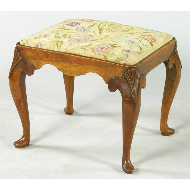 A rectangular walnut stool in early 18th century style, the drop-in needlework seat, above a shaped apron, on shell capped and scroll bracket cabriole legs to pad feet, 16.5in (42cm) h, 20.25in (51.4cm) w, 17in (43cm) d.