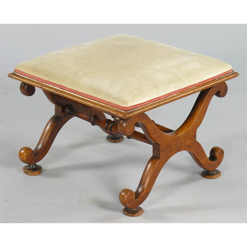 A Victorian walnut 'X' frame stool, the later seat above twin turned stretchers, to turned feet, 14.5in (37cm) h, 18.25in (46.2cm) sq.
