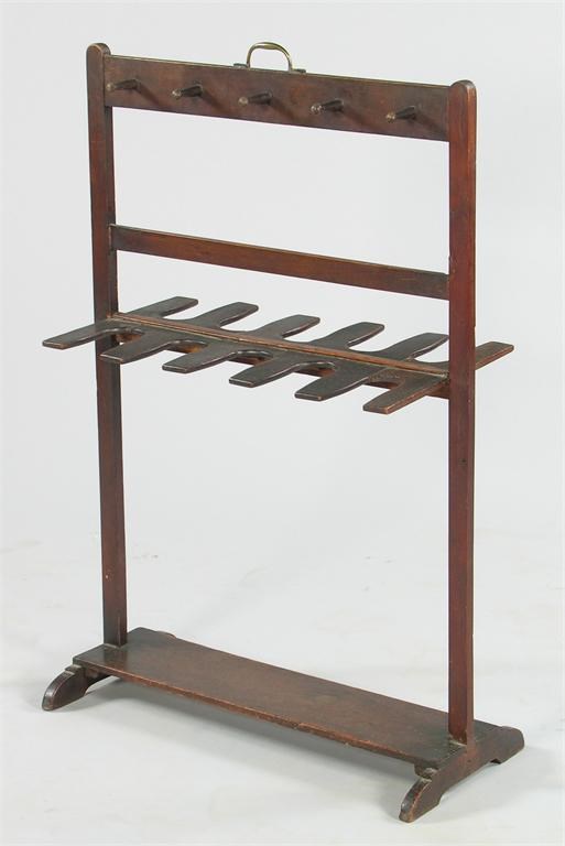 A 19th century mahogany boot and whip stand, with a brass carrying handle, 36in (91.4cm) h, 23.5in (59.6cm) w, 11in (28cm) d. Old restoration.