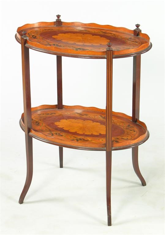 A late Victorian two tier mahogany and marquetry inlaid tagre, the turned oval finials to oval wavy galleried tiers inlaid a conch shell to satinwood bands with ribbon tied foliage, on square faux fluted supports to scroll feet, 28.25in (71.6cm) h, 21.75in (55cm) w, 14.5in (37cm) d. Remains of a paper label '....our St'.