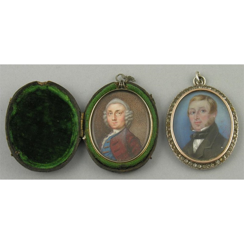 A George III oval portrait miniature, of a gentleman wearing a wig and a red coat, 1.75 x 1.25in (4.4 x 3.2cm) within a locket frame and leather folding case and another of a gentleman, mid 19th century. (2)