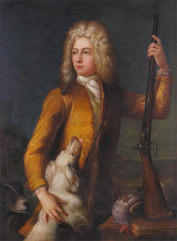 Follower of Charles Jervas. Portrait of a Huntsman with hounds, oil on panel, bears signature, 20th century, 15.75 x 11.75in. (40 x 29.8cm).