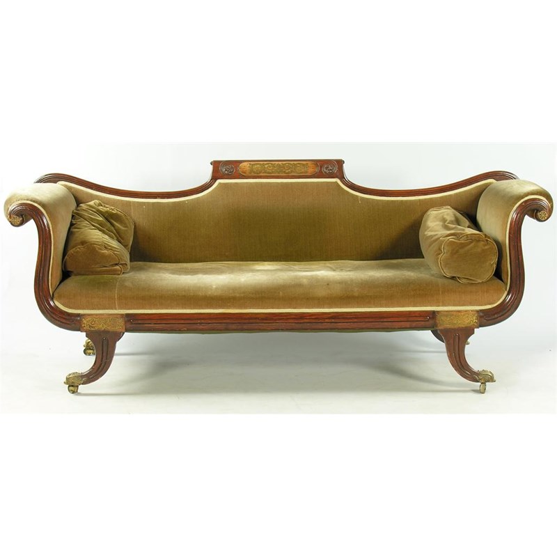 A George IV mahogany scroll end settee, with rosewood tablets inset brass marquetry, the scroll back centred a tablet with floret carving, on moulded scroll legs to cast brass shell and palmette sabots and castors, 34.25in (87cm) h, 86in (218.4cm) w, 29in (73.6cm) d.