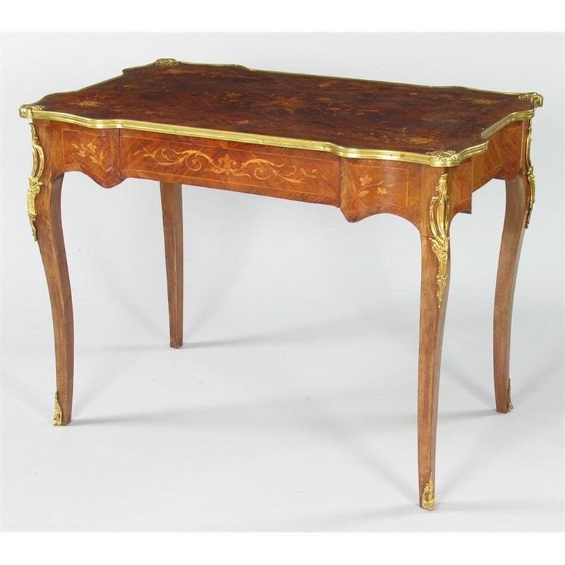 A French kingwood and marquetry inlaid centre table, with gilt brass mounts the shaped top above a central frieze drawer, on square cabriole legs, 29.5in (75cm) h, 39.75in (101cm) w, 25in (63.5cm) d.
