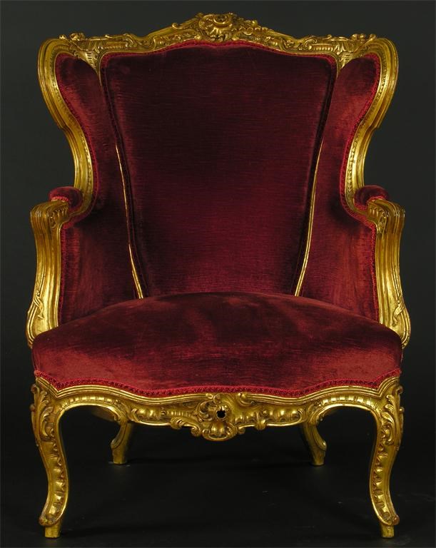 A French carved giltwood wing armchair, decorated foliage and scrolls, to plush padded upholstery.