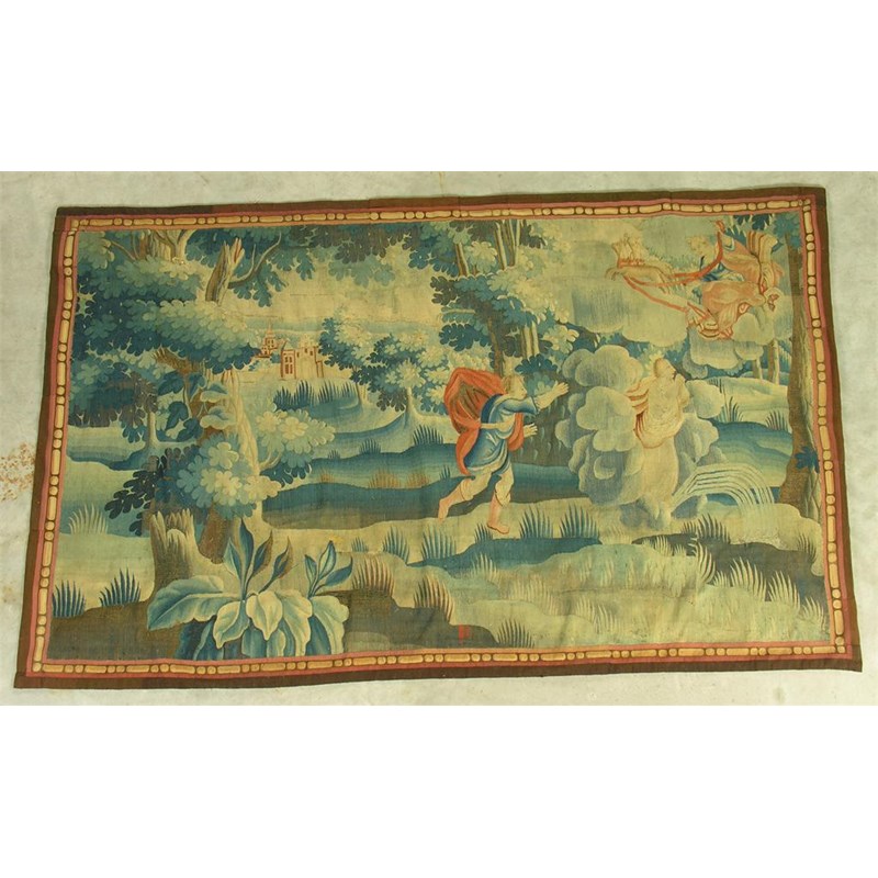 A Flemish tapestry fragment, late 17th / early 18th century depicting a mythological scene in a wooded landscape, with Diana in her chariot above two figures and a town in the distance, 63 x 100in (160 x 254cm).