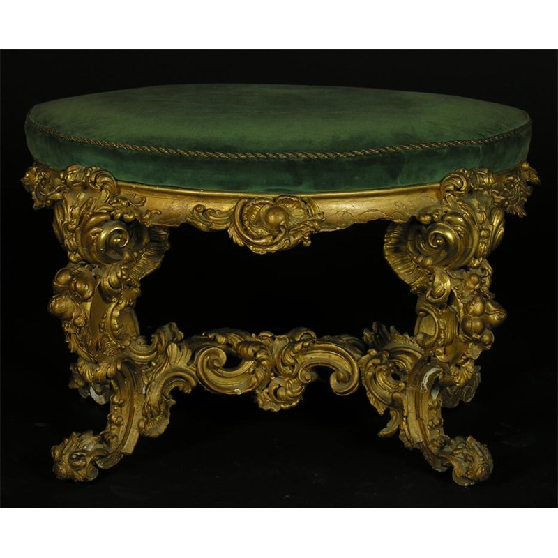 A French carved giltwood and gesso stool, the shaped padded top, on scroll, fruit and foliage base, 18in (45.6cm) h, 28in (71cm) w, 19in (48.3cm) d. Back frieze missing.