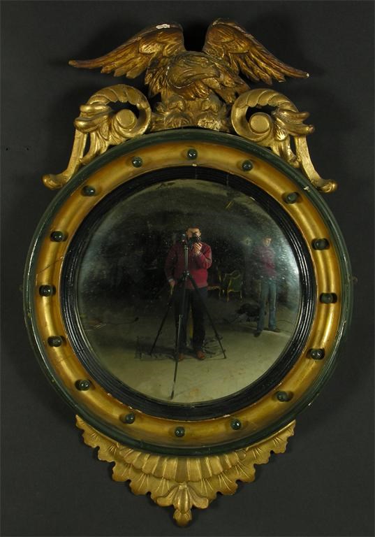 A giltwood and gesso convex mirror, having an eagle surmount to scrolls, a green painted outer edge and ball to a shell base, early 19th century and later, 35 x 22.5in (89 x 57cm),