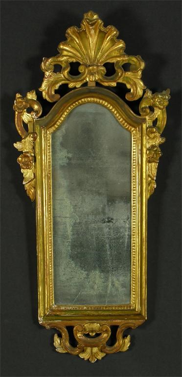An Italian carved giltwood and gesso wall mirror, the arched tapering plate to a shell surmount to foliage and scroll sides and base, the back inscribed 'B. Canal-Coni?, 29 x 13in (73.6 x 33cm).