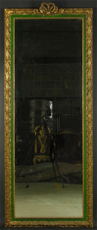 A modern gilt gesso pier mirror, the rectangular bevelled plate to a green painted border and a laurel frame with a ribbon tied surmount, 82.5in (209.5cm) h, 33.75in (87.7cm) w.