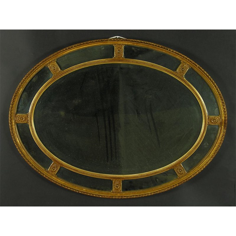 A late Victorian giltwood and gesso oval wall mirror in Adam style, the gadroon and beaded borders linked by oval florets, 29 x 39.25in (73.6 x 99.6cm).