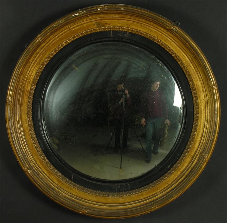 A 19th century giltwood convex mirror, the later ebonised slip to a leaf and reeded moulded frame, 25.75in (65.3cm) dia.