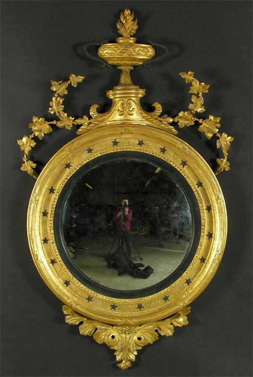 A giltwood and gesso convex mirror, the flaming vase surmount to leaf decoration, the tied baton frame with applied stars and a foliate base, 19th century and later, 47 x 26in (119.3 x 66cm).