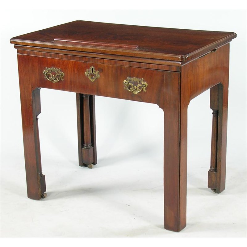 A George II mahogany architects table, the moulded edge cusp cornered top with a later rest, hinging on a ratchet and a further hinge to brass candle holders the walnut base with a fitted frieze drawer with later lined slide and a swivel ink drawer, on turned and block covered supports with leather roller castors, 32.5in (82.5cm) h, 35.5in (90cm) w, 23.5in (59.6cm) d.