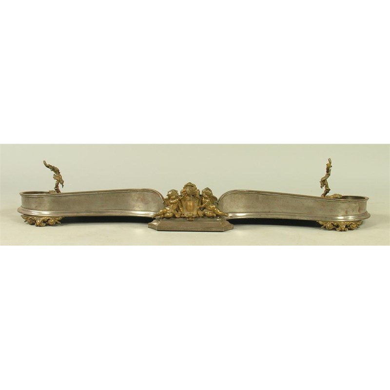 A French steel and gilt brass fender, of arc d'arbelet form, centred a vacant cartouche with a knight's helmet flanked by cherubs, the ends with trailing ivy implement rests, 11.5in (29.2cm) h, 59.25in (150.2cm) w.