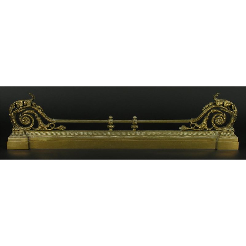 A 19th century gilt brass fender, the stepped base to a fluted and leaf edge, the reeded bar with leaf scroll ends, 12.5in (31.6cm) h, 49.5in (125.8cm) w.